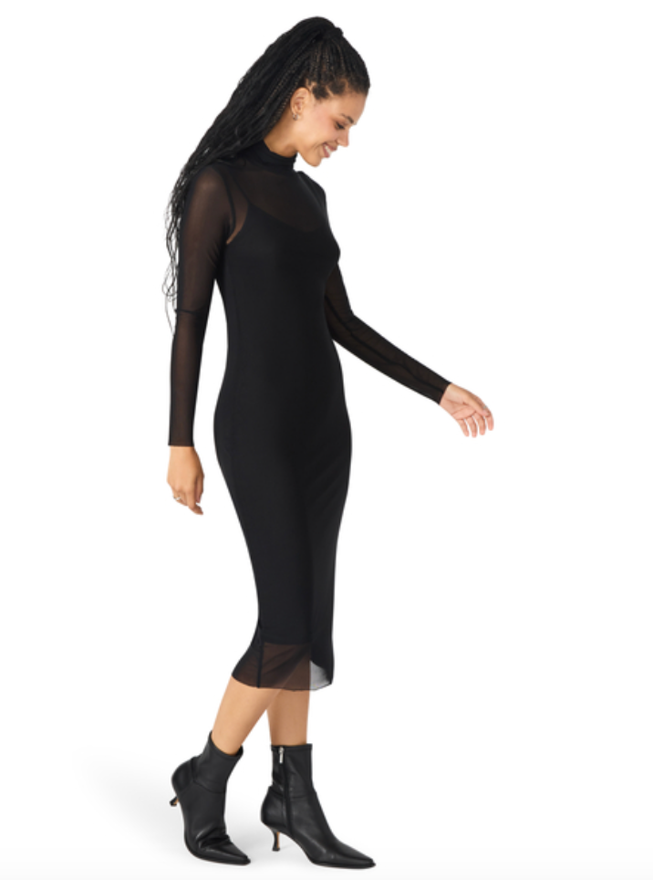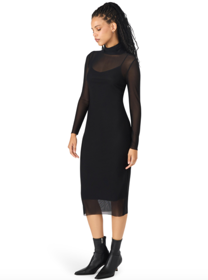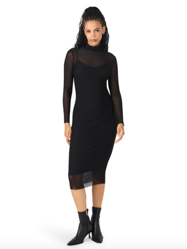 Sleek and modern, the Vivienne Dress features sheer long sleeves, a mock neckline, and a sheer hemline for a chic edge. Finished with a body-skimming fit and slip lining, it’s the perfect black midi for nights out.