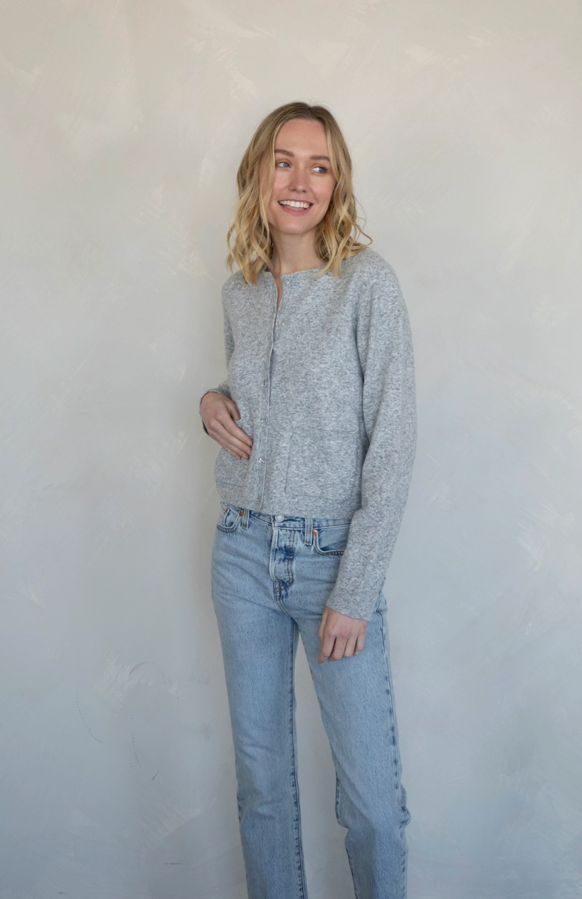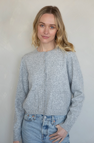 The Lyra Cardigan in heather gray is a timeless layering piece designed with everyday ease in mind. Made from a soft knit, it features a classic crew neckline, full-length sleeves, and a button-down front that allows versatile styling. Subtle front patch pockets add both function and charm, while the heathered texture gives it a cozy, elevated finish.
