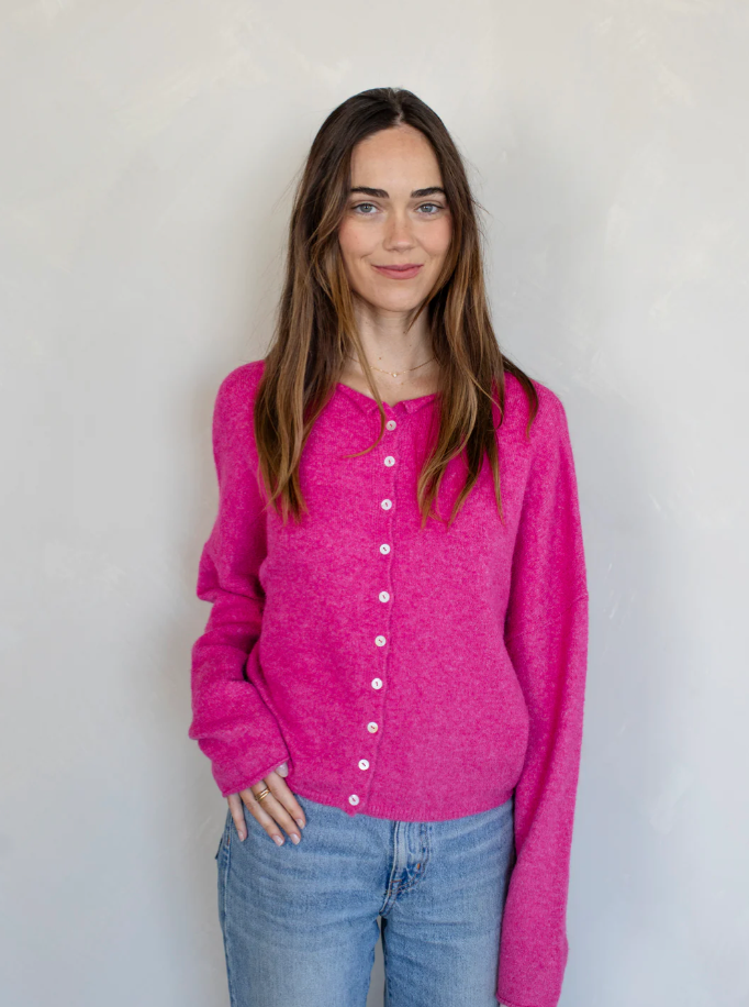 Make a bold statement with the Piper Cardigan in fuchsia. This vibrant knit is designed with a relaxed silhouette, button-front closure, and soft, cozy texture that’s as comfortable as it is eye-catching. The bright pop of color instantly elevates any look, while the slightly cropped fit keeps it modern and versatile.