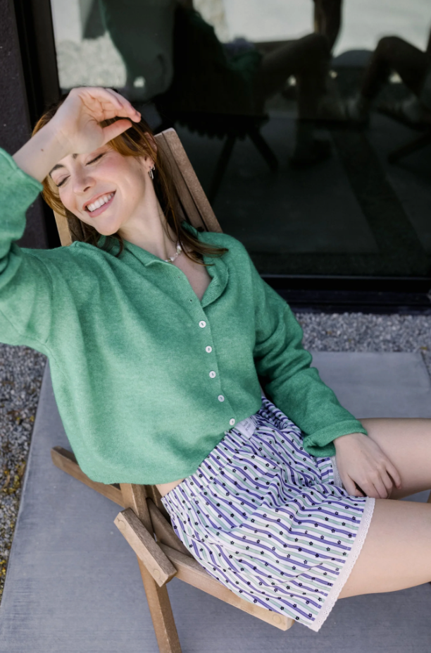 Its slightly cropped fit and long sleeves keep it versatile—wear it buttoned up as a top or open over your favorite basics. Effortless, comfortable, and bold, Piper is the cardigan that turns everyday looks into something special.