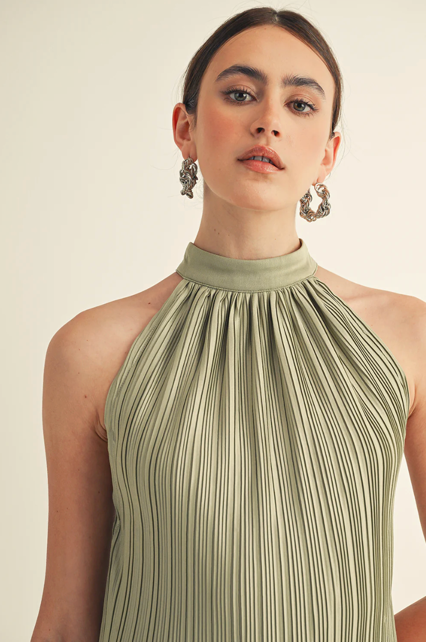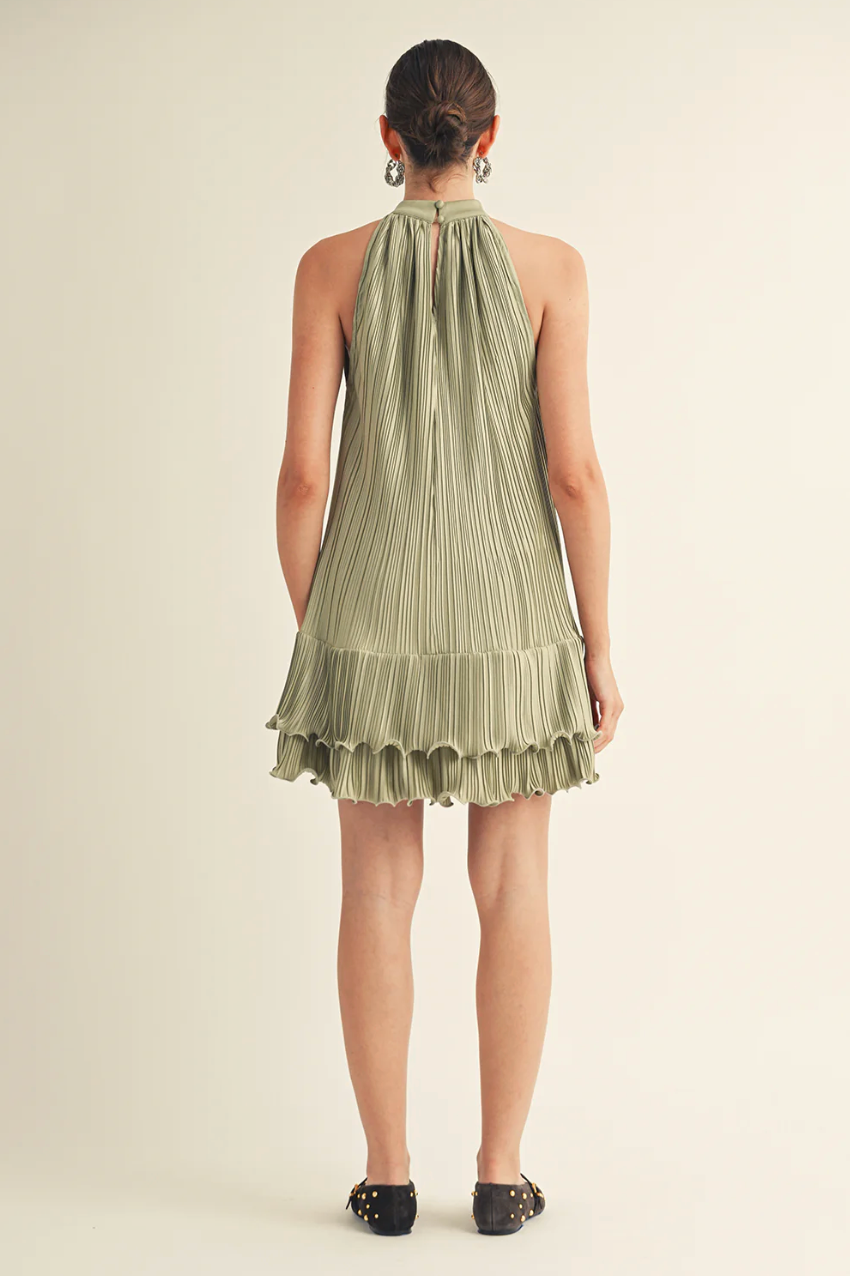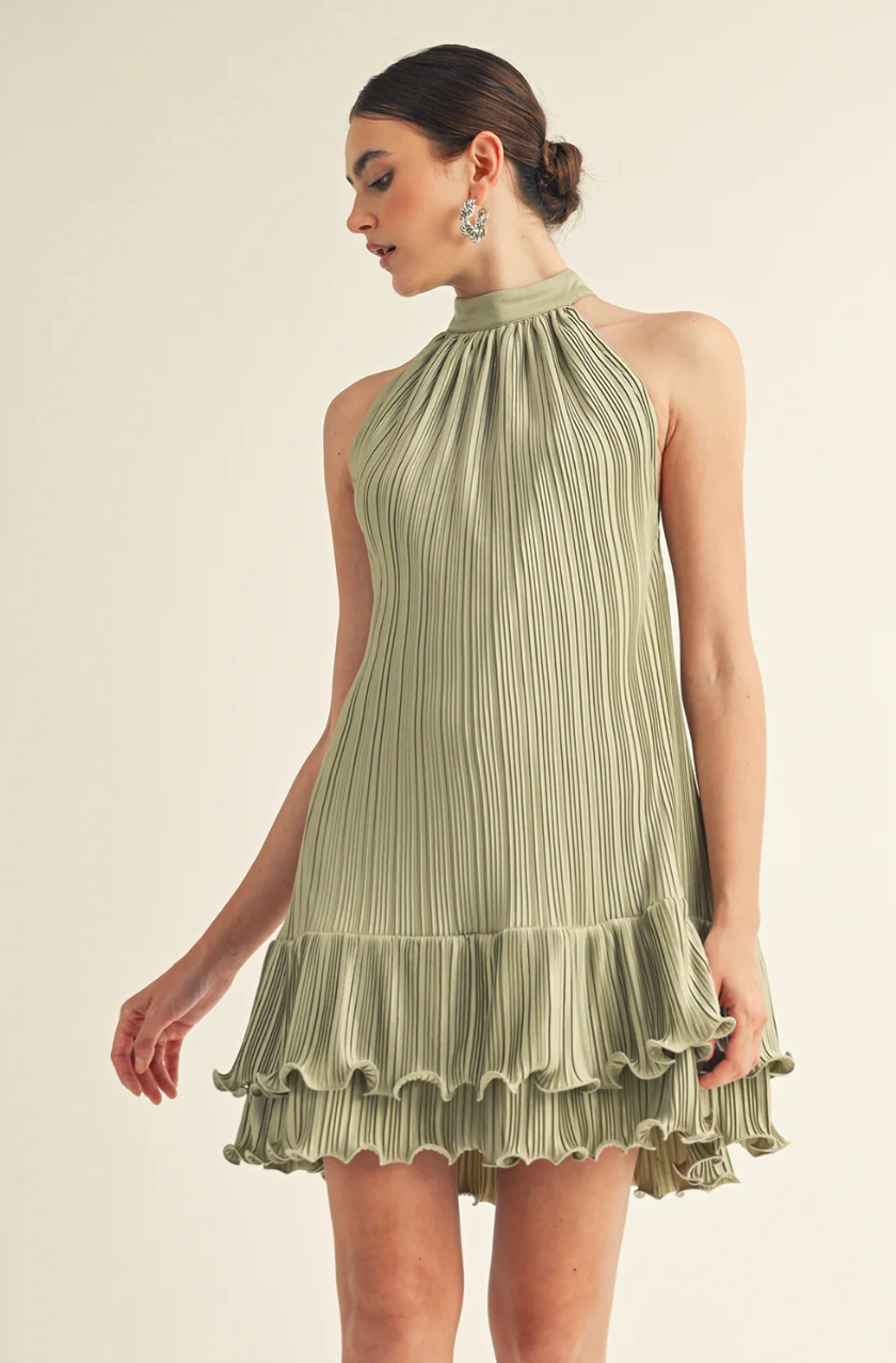 Meet the dress that does all the work for you. The Celestine Mini is an effortlessly chic, pleated halter dress crafted in a luxe sage-champagne satin that moves beautifully with every step. Designed with a soft A-line shape, a gathered mock-neck, and a double ruffled hem, she’s that perfect throw-on-and-glow moment for holiday parties, weddings, cocktails, and every event on your calendar.