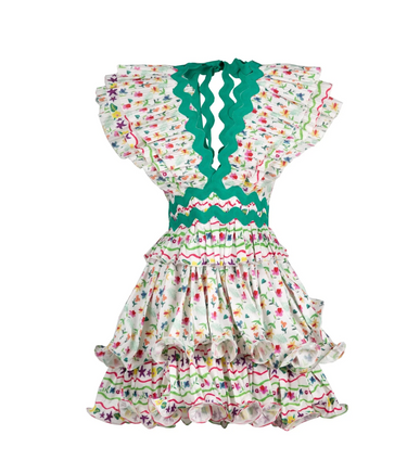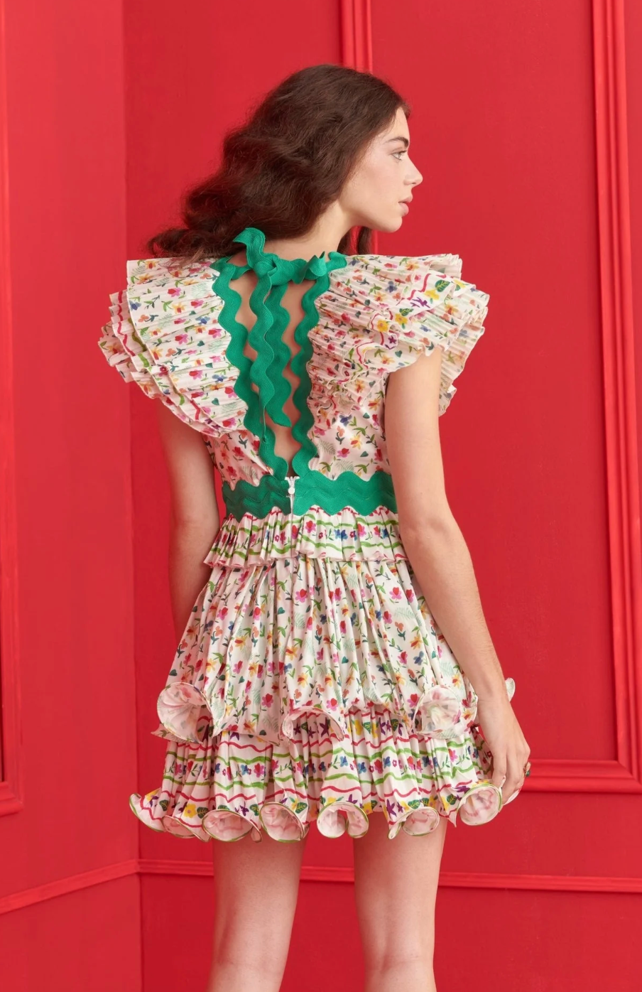 A statement mini bursting with color and charm. Featuring a vibrant floral print, dramatic ruffled sleeves, and a flattering deep V neckline trimmed with bold green ric-rac. Finished with a cinched waist and tiered ruffle skirt for playful movement — this dress is made to turn heads.