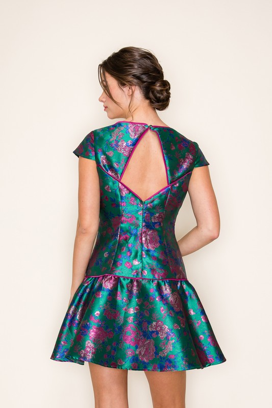 Introducing the HANNAH DROP WAIST DRESS, perfect for your winter wedding guest look! This stunning dress features a drop waist design and luxurious Jacquard floral print. The teal color adds a touch of charm to any occasion. Be the belle of the ball in this must-have dress!