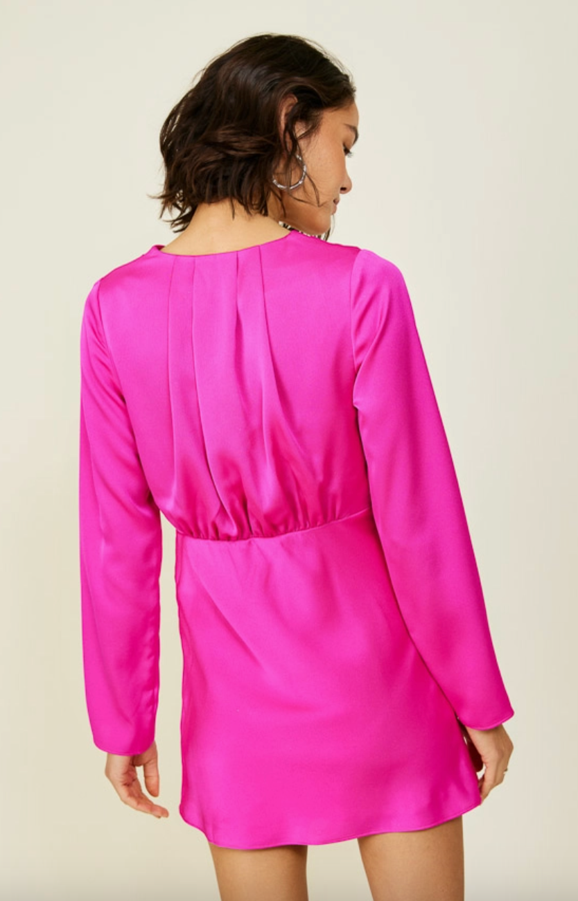 The Mika Satin Mini is sleek, bold, and made to shine. Designed in a vibrant magenta satin, this long-sleeve dress features a draped cowl neckline and a flattering cinched waist that flows into a chic mini skirt. Its lustrous finish and minimal silhouette make it a versatile piece for both cocktail nights and upscale dinners.