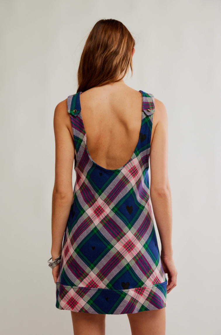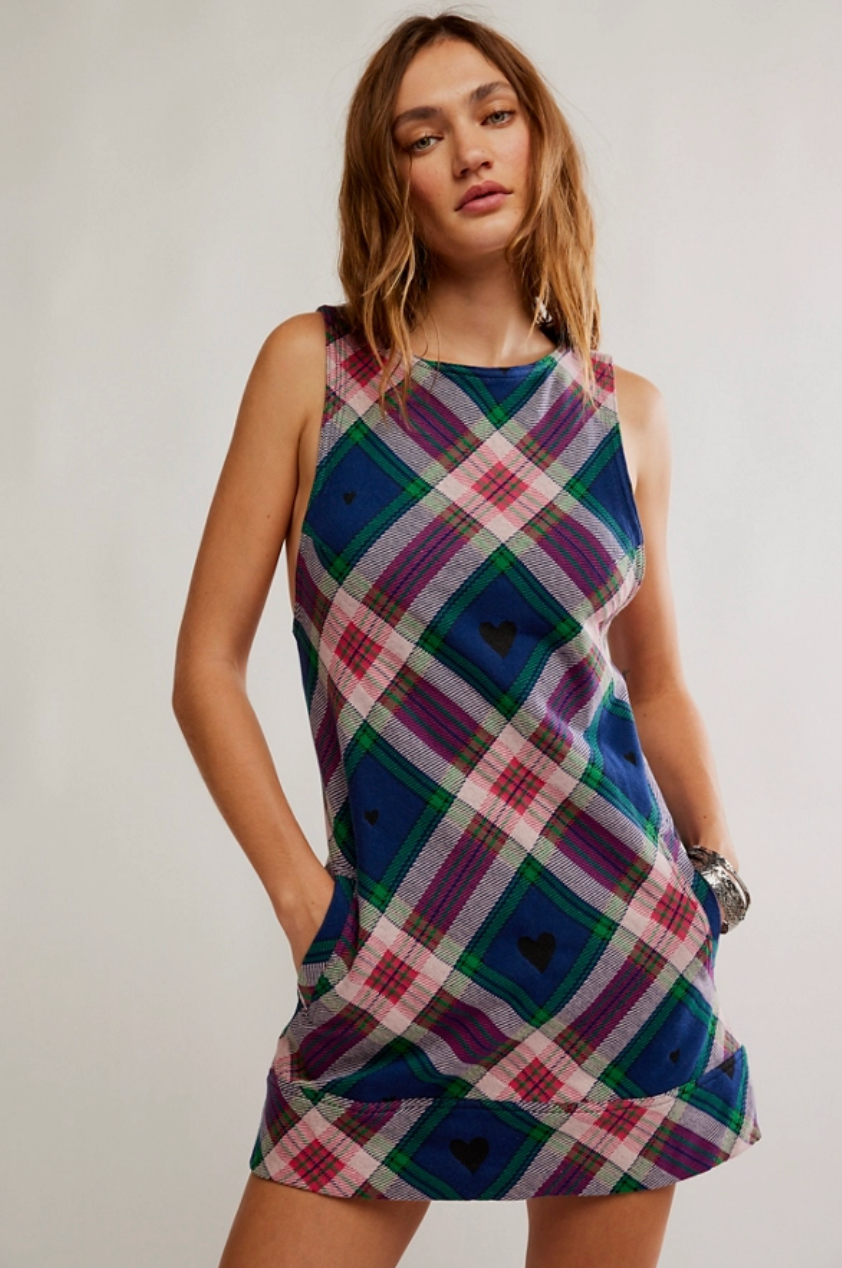 A playful twist on a classic plaid silhouette. The Carven Plaid Mini features a sleeveless, shift-style fit with a bold plaid pattern accented by subtle heart details for a signature Free People touch. Designed with a flattering high neckline and an open scoop back, this mini dress is equal parts sweet and statement-making. Finished with side pockets for effortless wear, it’s the perfect throw-on-and-go piece.