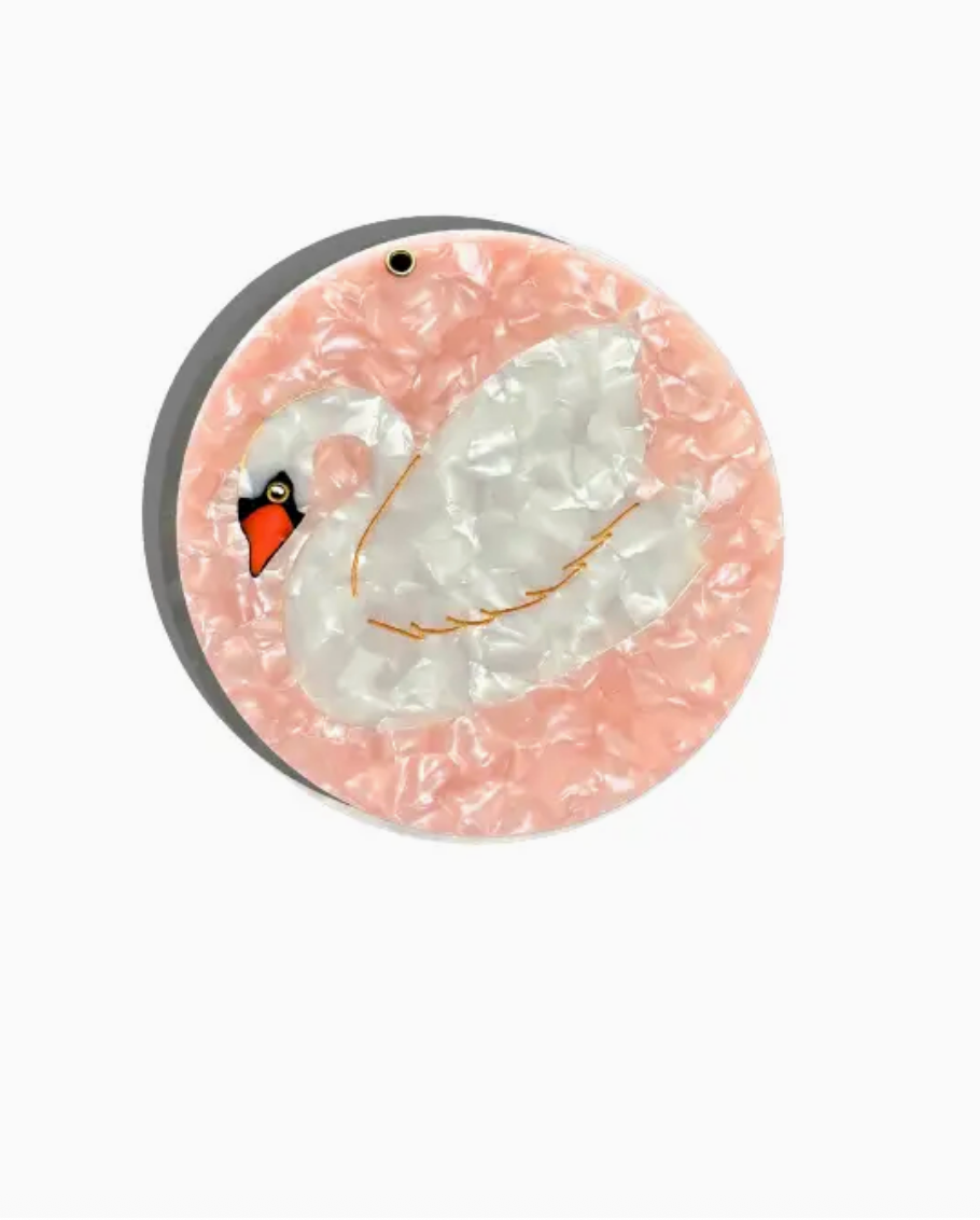 Grace meets glam in this dreamy swan compact mirror, hand-poured with soft pink and pearlized resin and adorned with a delicate swan design in shimmering gold detail. Featuring a swivel-open style and a high-quality dual mirror inside, it’s the perfect whimsical essential for on-the-go touch-ups.