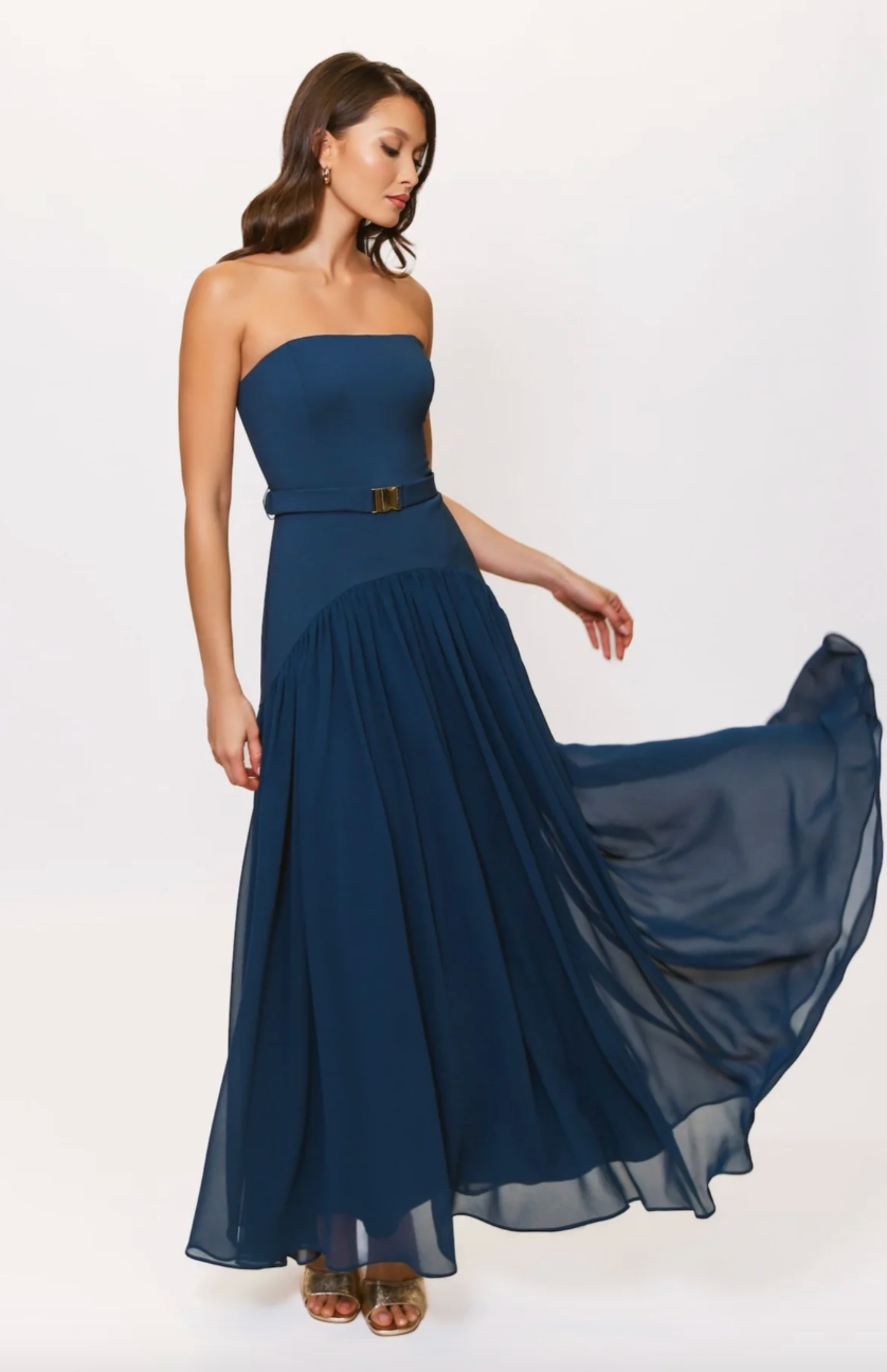 Timeless and chic, the Carmel Dress is a strapless navy gown designed with a fitted bodice, sleek belted waist, and flowy gathered skirt. The strapless neckline adds a modern, elegant touch, while the floor-length silhouette makes it perfect for weddings, galas, or evening occasions.