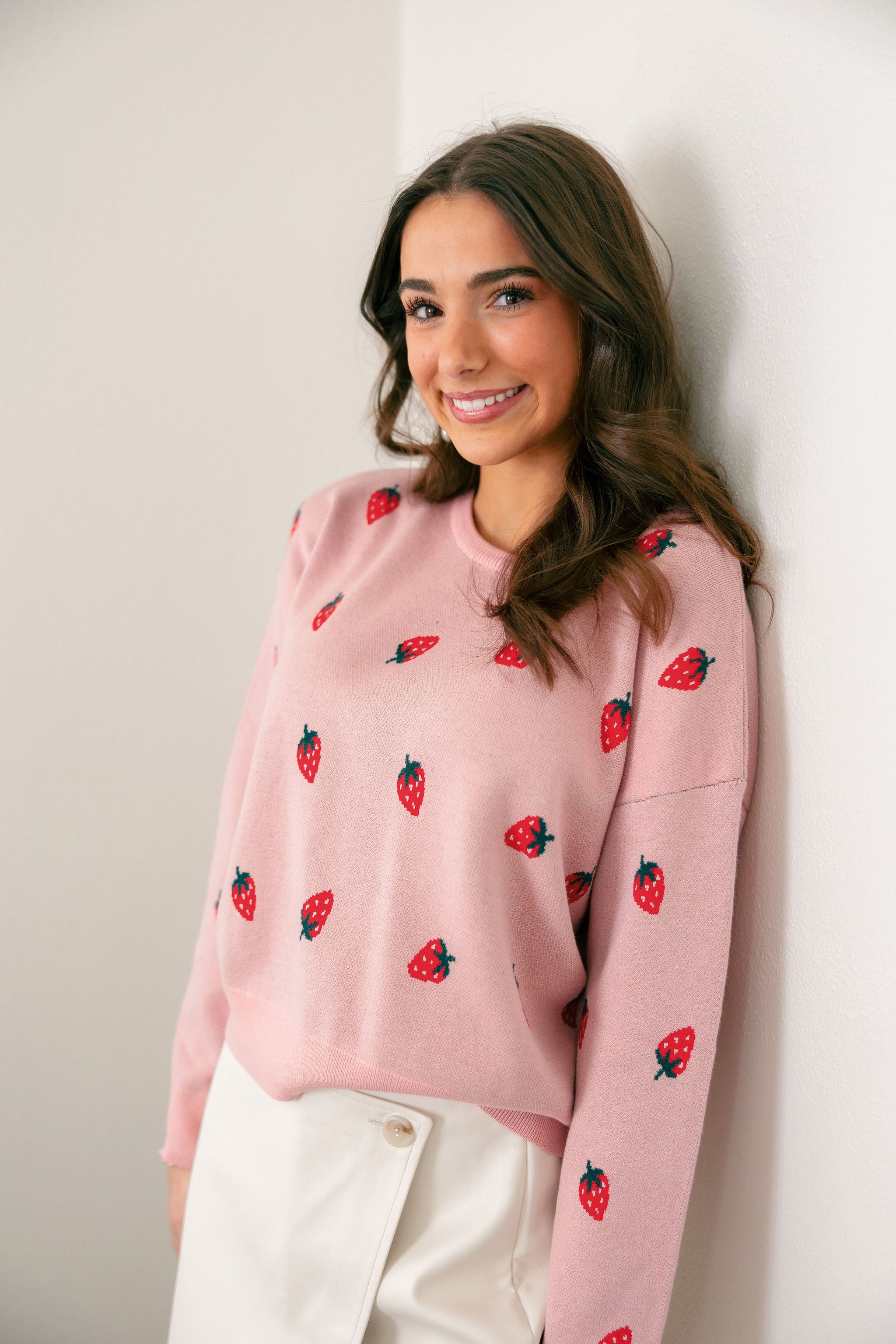 Sweet meets effortless in the Strawberry Fields Knit Sweater. Designed in a soft blush pink knit, this playful yet polished sweater features dainty strawberry motifs scattered throughout for a charming pop of color. The relaxed, slightly cropped silhouette makes it perfect for pairing with high-rise denim, skirts, or layered over a slip dress for an unexpected twist.